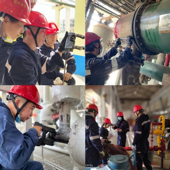 检验现场,党员充分发挥先锋模范带头作用,三个检验突击队充分发挥检验先锋作用,不怕苦,不怕累,攻坚克难。各个检验小组,分工协作,各司其职,繁忙有序,测厚、渗透、磁粉、超声波……以用勤劳和汗水勾勒出一幅幅顽强拼搏、敬业奉献的奋进画卷。吴斌、张萌、张克、韩晔等同志先后发现裂纹等缺陷7处。