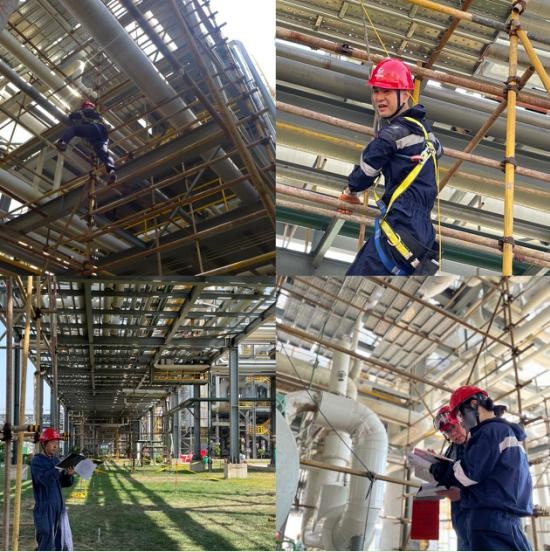 此次检验工作中的管道均为管廊,全部为高空作业,且恰逢连续高温天气,检验难度大,检验中,李志强、曹克源、杜涛等青年党员们争着抢着登高,带着安全带、防坠器,攀爬到30多米高的管廊上,汗如雨下,尽管累和热,但他们检验细之又细,不放过每一个缺陷,以严谨细致的工作作风为特种设备安全护航。