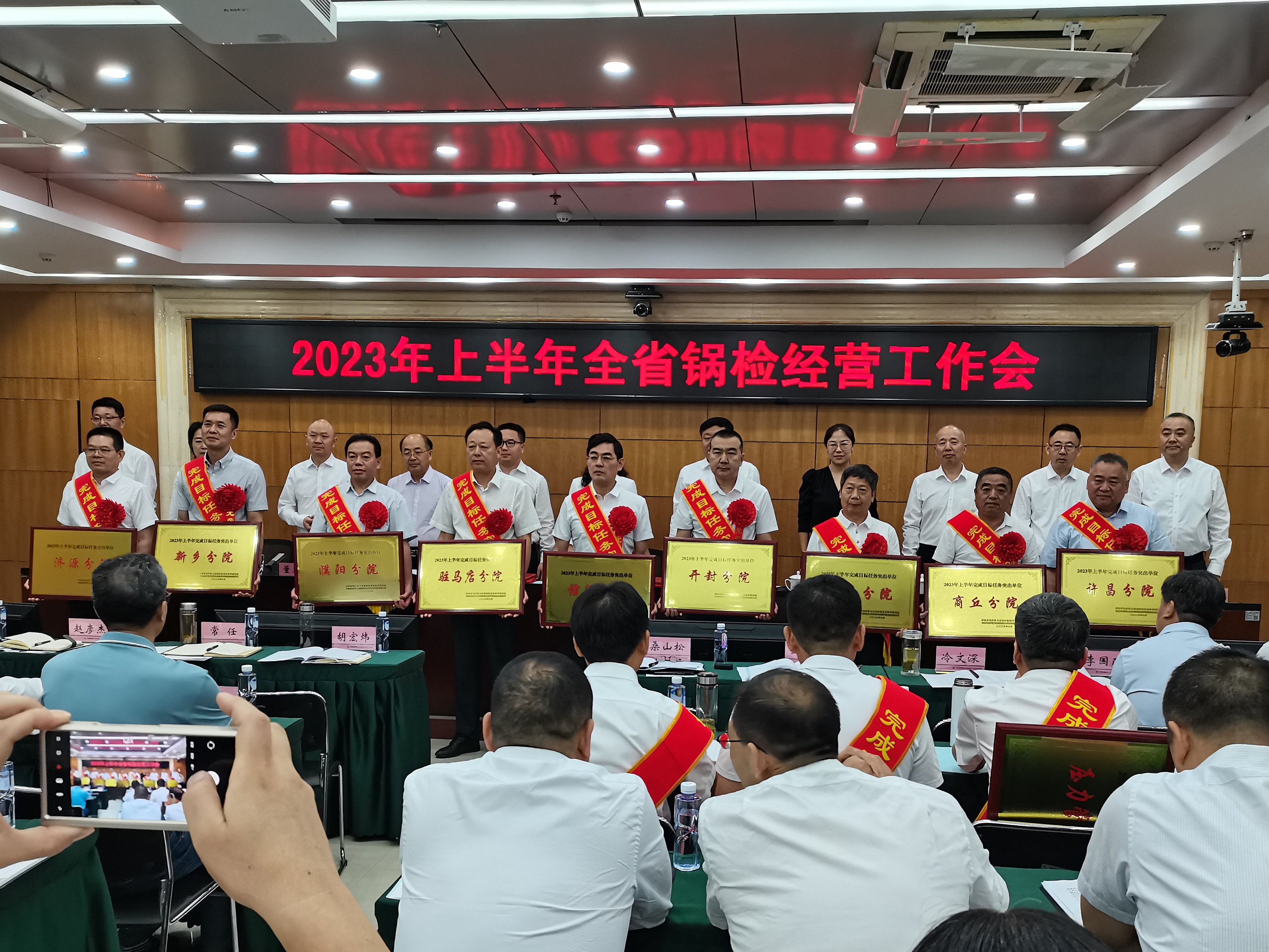 7月18日,2023年上半年全省锅检经营工作会隆重召开。会议通报表彰了一批先进集体和个人,新乡分院荣获“2022年度先进基层党组织”、“2023年上半年完成目标任务突出单位”,新乡分院负责人冷文深同志参加会议并上台领奖。