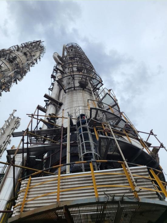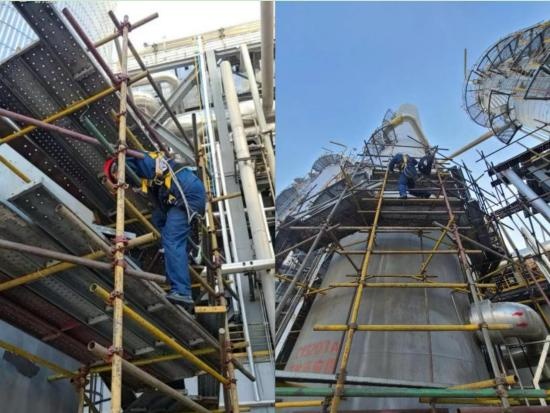 这些设备多为三十到五十米高,最高的甚至91.3米,检验难度大,工况复杂,检验环境十分恶劣,加之正值高温季节,检验任务异常艰巨。
